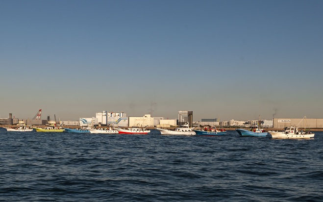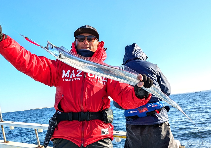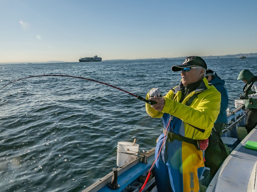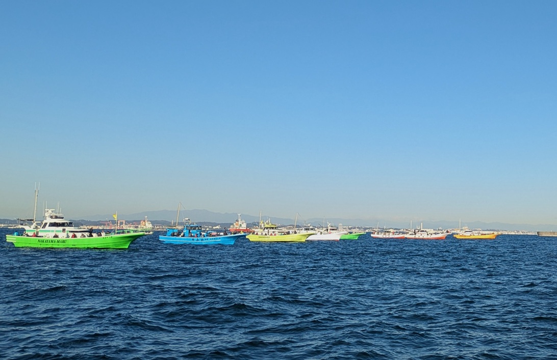 当日は、ひと足早い春を感じる晴天、凪の釣り日和に恵まれ、アジ船は午前8時10分に「川崎新堤」沖合、タチウオ船は午前7時50分に「第二海堡」沖合の集合場所に並んだ後、アジ船は本牧沖一帯、タチウオ船は走水沖を中心とした各釣り場へ散開していきました。