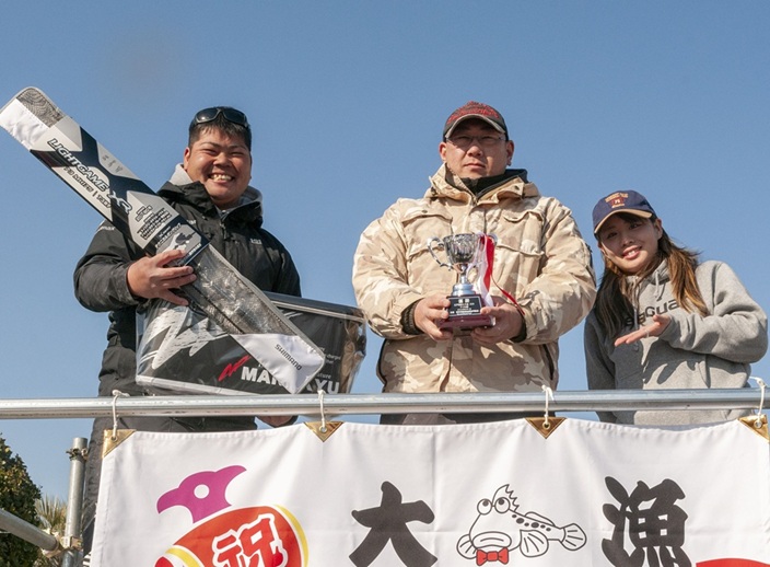 表彰式は平和島「まる八」桟橋で部門別に時間をずらし、先にアジ、次いでタチウオの順に船が集まって行われました。当組合の中山賢理事長は表彰式の挨拶で「冬季に熱気あふれる400人近くの皆様にお集まりいただけたことを大変ありがたく感じております。開催に際し、御協賛の品々をいただき、本日の運営に駆けつけてくださった企業の皆様、ありがとうございました。皆様にご注目いただける大会となりましたことに心より感謝申し上げます」と話し、自らも特別お楽しみ賞の電動リールを用意して大会の成功を喜びました。